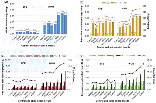 The total amino acid contents (n = 3, means ± SE) per 100 g of celery, anise, cumin, paprika, lemongrass, and oregano powder were 300.0 ± 31.5 mg, 189.4 ± 5.6 mg, 153.7 ± 1.3 mg, 476.8 ± 24.7 mg, 201.4 ± 5.9 mg, and 130.0 ± 22.2 mg, respectively. Thus, the total amount of free amino acids equivalent to 0.02 g of spice powder per 100 g of flour was 0–0.1 mg, and the free amino acids in the spices did not affect the free amino acid composition of the bread.