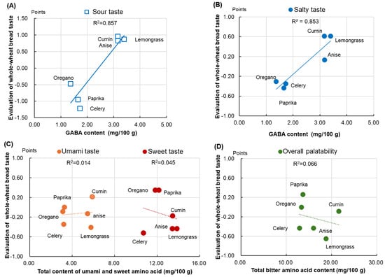Figure 2 presents the relationship between the free amino acid content and taste quality of the spice-added whole-wheat bread. Taste quality was evaluated through sensory testing using scoring methods and comparing the results with those of the control bread, which received 0 points.