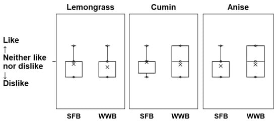 Comparison of the sensory evaluation of spice-added bread and the control bread. The evaluation was performed at three levels—like (+1), neither like nor dislike (0), and dislike (−1). The boxes show the lower quartile and upper quartile values of the data. The lines represent the median values. × represents the average value. The whiskers and circles represent the range of data (minimum value to maximum value), respectively, which were defined by the default settings of the Excel statistical function. SFB: Strong flour bread (n = 23); WWB: whole-wheat bread (n = 24). Data were analyzed using the Kruskal–Wallis test. Lemongrass: p = 0.347; cumin: p = 0.411; and anise: p = 0.821.