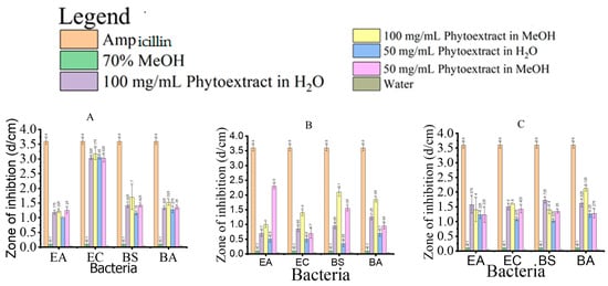 The agar diffusion method is well known for determining inhibition zones on agar plates. This method was used for screening the antibacterial activities of the crude phytoextract as described earlier [5], with some modifications. The sterilized LB agar was prepared as previously described [19], 20 mL was poured into each sterilized plate and allowed to solidify in a flow chamber. The LB agar plates were stored at −20 °C until use. Phytoextracts were screened against the following non-pathogenic organisms: Erwinia amylovora (EA); Escherichia coli (EC), Bacillus subtilis (BS), and Bacillus aquimaris (BA) using 100 µL of a defined organism. An optical density of 0.1 of the bacteria solution spread over an agar plate using sterile glass beads. Bacteria-covered agar plates were prepared with wells filled with 100 µL of extract solution. Controls included water, 70% MeOH, or ampicillin in the wells. After overnight incubation, zones of inhibition were assessed, reflecting the phytoextract’s bioactivity against microorganisms. The antibacterial activity test used in this experiment explored two solvents: an aqueous solvent and a 70% methanol solvent for dissolving the extracts.