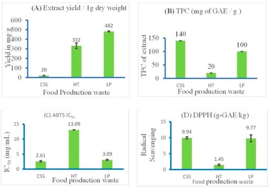 The extraction yields of the food production waste were successful, with high amounts obtained from each extract: CSS (20 mg/1 g), HT (331 mg/1 g), and LP (482 mg/1 g) (Figure 2A). Additionally, the extraction yields indicated significant differences between the means, with p < 0.05.