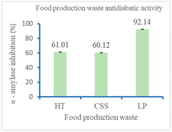 The percentage of α-amylase inhibitory activity was analyzed for the three extracts (Figure 3) using α-amylase. Comparing the three industrial waste extracts, they exhibited difference significance with p ≤ 0.05. Using 50 mg/mL of the LP extract exhibited the highest inhibition rate of 92.14%, while CSS and HT displayed almost the same inhibition effect with mean percentages of 60.12% and 61.01%, respectively.