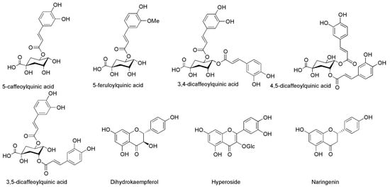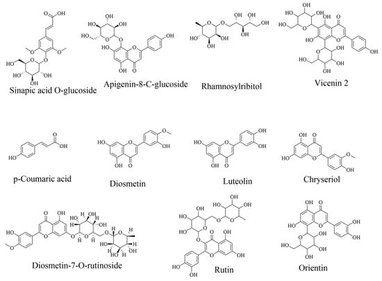 Herein, 34 compounds were identified using LC-ESI-QTOF-MS (Table 4) with literature and database matching. Characterization of the compounds indicated that Vicenin-2, which was previously identified in LP, eluted at 7 min with a major m/z mass of 593.1512 (C27H29O15) and its fragment ions at 353.0637 (base peak), 383.0748, and 325.0689. In addition, Lacitrin-O-rutinoside was identified in LP with a main m/z of 639.1569 (C28H31O17) and 315.0127 (base peak fragment), and other fragment ions at 330.0362, 316.0184, and 331.0452 at 31.3 min of the chromatogram. Eriodictyol was eluted at 44.2 min with an m/z peak at 287.0561 (C15H11O6) and its characteristic fragment ions were 135.0435 (base peak), 134.0365, 83.0117, and 151.0054 [39]. The structures of some of the compounds identified in the LP extract are shown in Figure 6.