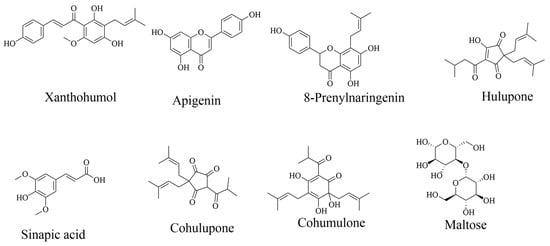 Compounds identified in hot trub phytoextracts by LC-ESI-QTOF-MS. Detailed information in Table 3.