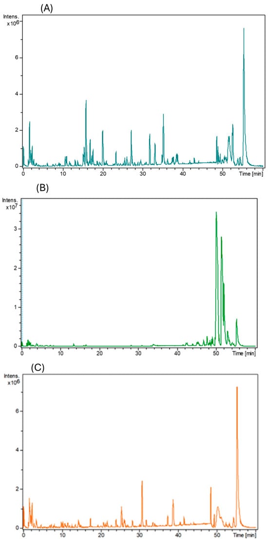 LC-ESI-QTOF-MS base peak chromatograms of phytoextracts in negative ion mode: (A) coffee silverskin with details in Table 2, (B) hot trub with details in Table 3, and (C) lemon peel. All plots represent intensity versus retention time. Details of identified compounds are in Table 2, Table 3 and Table 4.