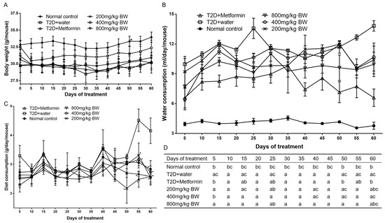 (A) Effect of TPs treatment on body weight of each group of mice. (B) Effect of TPs treatment on water consumption of each group of mice. (C) Effect of TPs treatment on diet consumption of each group of mice. (D) List of results of one-way ANOVA of values in the diet consumption among different groups. Data are expressed as means ± SD (n = 9). * p < 0.05 as compared to the T2D+water group.