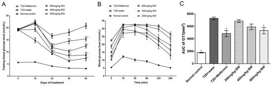The tail vein blood at various time points, including 0, 15, 30, 60, 120, and 240 min, was sampled and measured using a blood glucose meter to characterize the status of glucose tolerance profiles. Glucose at a dose of 1 g/kg·BW was administered to mice given the indicated treatments by oral gavage after 12 h of fasting. At 15 time points, values for the T2D+water, T2D+metformin, and 200, 400, and 800 mg/kg·BW groups were significantly higher, by 1.63-, 1.40-, 1.63-, 1.60-, and 1.20-fold (p < 0.05), respectively, than the normal control group, and the 800 mg/kg·BW group decreased by 16.67% compared with the T2D+water group. The glucose assimilation peak in most diabetic mice was 30 min. At this time point, the values for the T2D+water, T2D+metformin, and 800 mg/kg·BW groups were significantly higher by 2.20-, 1.81-, and 1.72-fold, respectively, than the normal control group, and the 800 mg/kg·BW group significantly decreased by 14.87% compared with the T2D+water group. No significant difference existed among the T2D+water and 200 and 400 mg/kg·BW groups after 60 min of glucose administration. The T2D+water group still had a significantly higher glucose content than the normal control group by 2.53-fold. However, the T2D+metformin and 800 mg/kg·BW groups significantly decreased by 21.85% and 16.62%, respectively, compared with the T2D+warter group. At the 240 min time point, the blood glucose values were 5.2 ± 0.13, 26.4 ± 1.49, 13.1 ± 2.36, 23.6 ± 1.42, 19.6 ± 2.25, and 16.4 ± 2.07 mmol/L in the normal control, T2D+water, T2D+metformin, and 200, 400, and 800 mg/kg·BW groups, respectively. The blood glucose of T2D+water still maintained a significantly higher concentration than the normal control by 3.01-fold. In addition, the T2D+metformin and 800 mg/kg BW groups also significantly decreased by 50.38% and 37.88%, respectively, compared with the T2D+water group. The AUC of the indicated treatments was calculated based on individual glucose profiles (Figure 2C). The AUC index of the T2D+water group was significantly higher than that of the normal control by 3.07-fold, while the AUCs of the T2D+metformin and 800 mg/kg·BW groups were significantly decreased by 33.57% and 26.82%, respectively, compared with that of the T2D+water group. The above results demonstrated that administration with TPs could significantly decrease the fasting blood glucose of T2D mice in a dose-dependent manner. TPs may possess superior hypoglycemic activity.