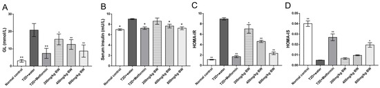 An optimal dose evaluation experiment on TPs was conducted before the present experiment, and the results demonstrated that the therapeutic effect of TPs showed a trend of enhancement with the increase in concentration, reaching the best therapeutic effect at 800 mg/kg, and then a trend of decline after 800 mg/kg. Therefore, 800 mg/kg was used as the highest dose of the mouse administration concentration, and the doses of 200 mg/kg and 400 mg/kg were set downward based on the proportional relationship. Type 2 diabetes mellitus mice were randomized into five groups with 20 mice in each group. Diabetic control group: type 2 diabetes mellitus control mice were administered an equal amount of distilled water daily; positive control group: diabetic mice were administered metformin hydrochloride (250 mg/kg·BW, p.o. Three tea polysaccharide treatment groups were established according to the following methods: Diabetic mice were administered tea polysaccharides at 200, 400, and 800 mg/kg·BW (p.o.) per day, respectively. Healthy mice were considered a normal control group and administered an equal amount of distilled water. Treatment was continued for 60 days. During the whole process, the normal mice were given a normal diet, while the diabetic mice were given an HFD. The animals exposed to tea polysaccharides were not found to have side effects in behavior and general health. The body weight and total consumption of food and water were monitored every 3 days and varied between the groups. Serum insulin levels and fasting blood glucose were measured every 30 days.