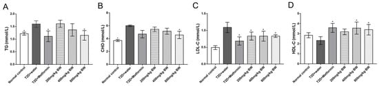 Antihyperlipidemia effects of TPs in each group of mice on serum lipid levels: (A) triglyceride; (B) total cholesterol; (C) low-density lipoprotein cholesterol; and (D) high-density lipoprotein cholesterol. Data are expressed as means ± SD (n = 9). * p < 0.05 as compared to the T2D+water group.