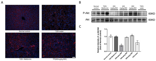 The pathogenesis of T2D is a process that activates complex molecular pathways. Existing evidence suggests that Akt/PKB plays a key role in hyperglycemia and reduces glucose transport in muscle tissues while inhibiting the release of glucose from hepatocytes [14]. Phosphorylated Akt, in an activated state, was able to promote muscle and adipose tissues to take up glucose stimulated by insulin while inhibiting the release of glucose from hepatocytes. Insulin affects the glucose uptake of peripheral tissues through Akt/PKB by translocating GLUT to the cell membrane, thereby promoting glucose uptake [15]. In this study, Western blot analysis showed that the protein expression of p-Akt in the liver of diabetic mice treated with TPs (0.95- and 1.06-fold of normal control mice in the 400 mg/kg·BW group and 800 mg/kg·BW group, n = 9) was increased significantly compared with that in the T2D+water group (0.59-fold of normal control mice, n = 9, p < 0.05). Strongly positive immunoreactivity for p-Akt was observed in the livers of TP-treated and metformin-treated diabetic mice, whereas biopsies from T2D+water mice were negative and different from normalcy (Figure 5A), indicating that TPs might exert hypoglycemic activity by inhibiting the phosphorylation of Akt.