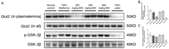 The redistribution of GLUT2 promoted the uptake of glucose, which resulted in the lowering of postprandial blood glucose. Activated Akt could promote translocation, stimulated by insulin, of the glucose transporter GLUT2 to the plasma membrane of the liver cell. In our results (Figure 7A,B), after administration of TPs and metformin, the expression of GLUT2 in the plasma membrane was improved significantly compared with that in the T2D+water group. (0.78-, 0.84-, 0.9393-, and 0.16-fold of normal control mice in the T2D+metformin, 400 mg/kg·BW, 800 mg/kg·BW, and T2D+water groups, respectively, n = 9). According to our results, after administration of TPs and metformin, the expression of GLUT2 in the plasma membrane was improved significantly compared with that in the T2D+water group. (0.78-, 0.84-, 0.9393-, and 0.16-fold of normal control mice in the T2D+metformin, 400 mg/kg·BW, 800 mg/kg·BW, and T2D+water groups, respectively, n = 9).