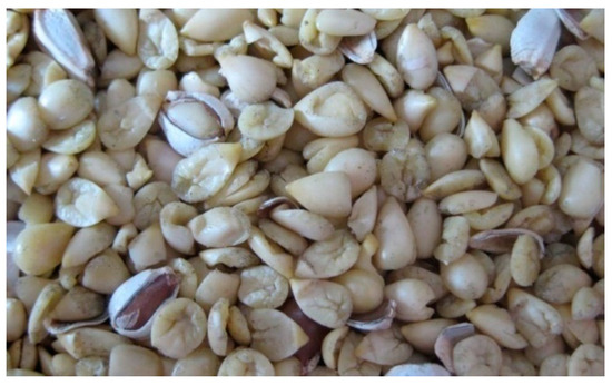The seeds of the safflower variety Akmai, obtained from samples in the World Safflower Collection at the Red Falls breeding station, were used for pressing [47]. This safflower variety (Figure 1) was grown in the Akmola region of Kazakhstan on experimental crops managed by the S. Seifullin Kazakh Agro Technical Research University, Astana, Kazakhstan. Akmai is the most popular safflower variety in Kazakhstan because of its high yield and resistance to diseases and climatic conditions. Consequently, it is widely grown in the Aktobe, Almaty, Zhambyl, Kyzylorda, South Kazakhstan, and Akmola regions. The fat content in fully dry seeds is 36–37%, while in kernels it is 55–55.7%, and the initial moisture is 5.8% [48].