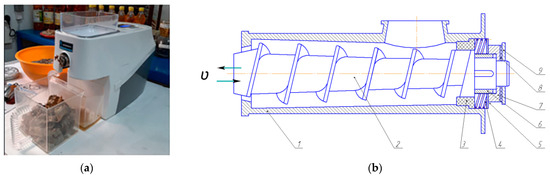 Figure 2. Experimental setup of the Dream Modern ODM-01 screw press (а) general view of the press equipment; (b) cross-sectional view of the press equipment: υ—progressive motion of the screw; 1—grain cylinder; 2—pressing screw; 3—sliding tip; 4—pressure regulator spring; 5—washer; 6—threaded nut; 7—lock nut; 8—rubber sealing ring; 9—control nut.