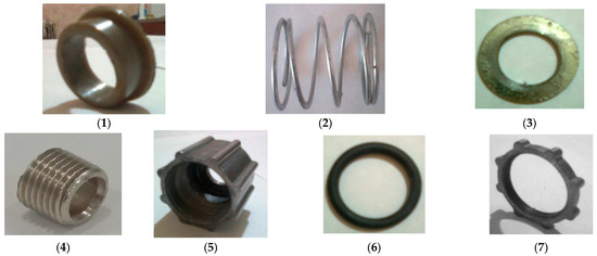 Figure 3. Pressure-regulating mechanism: (1)—sliding tip; (2)—pressure regulator spring; (3)—washer; (4)—screw nut; (5)—lock nut; (6)—rubber sealing ring; (7)—check nut.