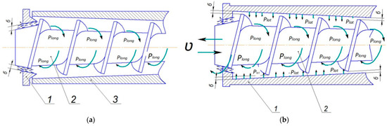 Figure 4. Diagram of pressure direction in the screw press using the standard approach (a) (δ—outlet opening narrowing due to pressure regulating mechanism; Plong—longitudinal pressure created by the outlet opening; 1—pressure regulating cone; 2—pressure screw; 3—gape cylinder) and the proposed solution (b) (Plat—lateral pressure caused by narrowing of the gap between the screw and the gape cylinder; υ—direction of the pressing screw forward and backward movement; δ—adjustable gaps between the screw and the gape cylinder using the pressure adjustment mechanism; 1—gape cylinder; 2—pressing screw) pressure control mechanisms.