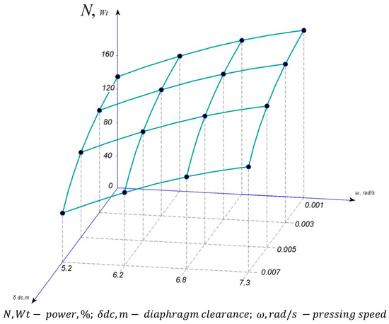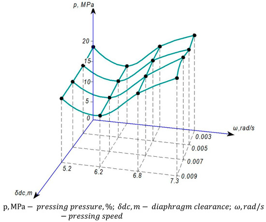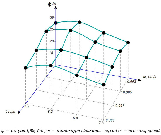 The graph in φ−oil yield, %; δdc−diaphragm clearance, m; ω−pressing speed, rad/s.