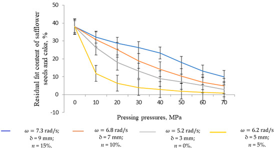 Figure 6. Dependence of the amount of residual fat in safflower cake during pressing on the speed and aperture of the diaphragm, as well as the percentage of husk content.