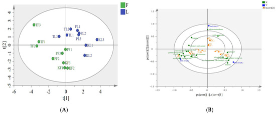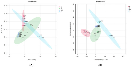 PCA score plot and PLS–DA score plot of three species of the genus Amomum. ((A) PCA score plot of A. tsao-ko, A. paratsaoko, and A. koenigii from different parts; (B) PLS–DA score plot of A. tsao-ko, A. paratsaoko, and A. koenigii from different parts).
