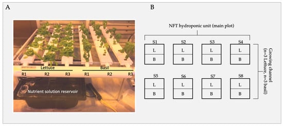 Experimental design. (A) Nutrient flow technology (NFT) hydroponic unit (main plot S) consisted of six growing channels: three lettuce (n = 3 channels; subplot L) and basil (n = 3 channels; subplot B), each containing six plants per channel. (B) A schematic of the split-plot experimental set-up. Each plot (S1–8) received different treatments. Crops were randomly sampled weekly until harvest (Day 1, Day 7, Day 14, Day 21, Day 28).