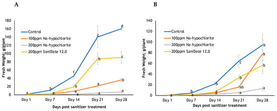 Effect of sanitizers on (A) fresh edible lettuce weight (g shoots/plant) and (B) fresh edible basil weight (g shoots/plant). Mean values are pooled from three experiments (n = 9). Specific time points that share the same letters are not significantly different at the 5% level based on Fisher’s LSD post-hoc analysis. Bars represent the mean standard error.