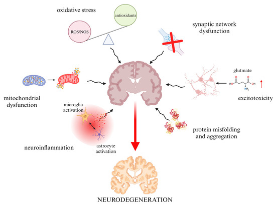 The causes of neurodegeneration. The neurodegeneration process may be caused by various types of abnormalities; the most common of them are (i) increased levels of oxidative stress, (ii) synaptic network dysfunction, (iii) excitotoxity resulting from high glutathione levels, (iv) incorrect folding of proteins and their accumulation in the form of aggregates, (v) neuroinflammation resulting from excessive stimulation of microglia, and (vi) mitochondrial dysfunction causing, among others, increasing concentrations of reactive oxygen species (ROS) and intensifying apoptosis. This figure was made with Biorender.com (accessed on 15 May 2024; Agreement no. YP26TQSS3W).