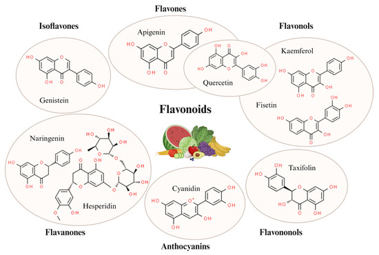 Classification of flavonoids and representatives of each group, described in the text. This figure was made with Biorender.com (accessed on 15 May 2024; Agreement no. GD26TLR8VA).