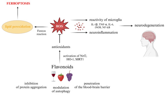 Examples of some of the neuroinflammatory and neuroprotective effects of flavonoids. Flavonoids, due to their ability to modulate autophagy, prevent the formation of protein aggregates and the ability to cross the blood-brain barrier, have important neuroprotective functions, particularly important in neurodegenerative diseases. By activating the Nrf1/HO-1 pathway, as well as improving mitochondrial function by targeting SIRT1 activity, these compounds alleviate the oxidative stress, and effectively reduce ROS formation. When occurring at high levels, ROS can act in various ways, including (i) stimulation of the Fenton reaction, which by increasing lipid peroxidation may contribute to ferroptosis that seems to be important in neurodegenerative diseases, (ii) induction of neuroinflammation which is one of the causes of the initiation and progression of neurodegeneration. Flavonoids inhibit ferroptosis by reduction of ROS levels, and cause a decrease in levels of inflammatory markers (TNF-α, IL-6, IL-1β, iNOS, and NF-κB), positively influencing the survival of neurons and silencing neuroinflammation. This figure was made with Biorender.com (accessed on 15 May 2024; Agreement no. SC26TLT68T).