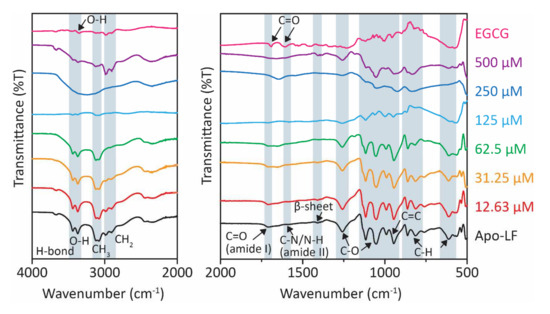 - Yang, W.; Liu, F.; Xu, C.; Yuan, F.; Gao, Y. Molecular interaction between (−)-epigallocatechin-3-gallate and bovine lactoferrin using multi-spectroscopic method and isothermal titration calorimetry. Food Res. Int. 2014, 64, 141–149. [Google Scholar] [CrossRef]