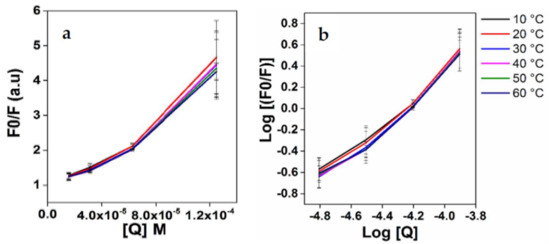| Temperature (°C) | Kq (×1012) | Ksv (×104 M−1) | K (×102 M−1) | ΔG° (kJmol−1) | ΔH° (kJmol−1) | ΔS° (Jmol−1K−1 × 1013) |