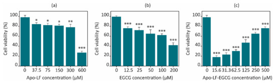 | Sample | Apo-LF (10 µM) | Apo-LF-EGCG Conjugates (µM) | |||||