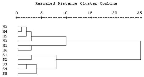 Incorporating factors such as moisture content, sugar composition (fructose, glucose, and sucrose), 10-HDA, and stable carbon isotopes revealed intriguing patterns. Hierarchical analysis delineated two distinct categories among the samples under study, as illustrated in Figure 2. Samples S1–S5 formed one cohesive group, characterized by a prevalence of sucrose among the sugars and higher stable carbon isotopic values. In contrast, samples H1–H6 constituted the other category, exhibiting a divergent profile in terms of sugar composition and stable carbon isotopes.