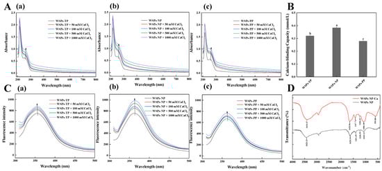 (A) UV−Vis spectra of (a) WSPs−TP, (b) WSPs−NP, and (c) WSPs−PP with different concentrations of CaCl2 over a wavelength range from 200 to 800 nm. (B) Calcium binding capacity of WSPs−TP, WSPs−NP, and WSPs−PP. (C) Fluorescence spectra of (a) WSPs−TP, (b) WSPs−NP, and (c) WSPs−PP with different concentrations of CaCl2 over an emission wavelength ranging from 310 to 500 nm at an excitation wavelength of 295 nm. (D) FTIR spectra of WSPs−NP and WSPs−NP−Ca in the regions from 4000 to 400 cm−1. Note: The different letters mean significant differences p < 0.05 within the same indicator.