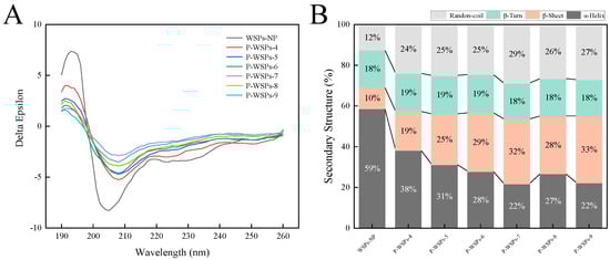 The CD spectra were obtained following the method described by Sun et al. [], with minor modifications, using a 4710KL-04W-B10 CD spectropolarimeter (Shanghai, China). The far-UV CD spectra of 1 mg/mL of WSPs and P-WSPs in 50 mM phosphate buffer (pH 7.4) were recorded at 25 °C, with a spectral resolution of 0.1 nm, a scan speed of 100 nm/s, a response time of 0.125 s, and a bandwidth of 1 nm, in the region of 190 to 260 nm. The optical path of 0.1 cm quartz cells was utilized. The acquisition involved gathering 16 scans in total, which were then averaged. An average from three different spectra was used for each sample.