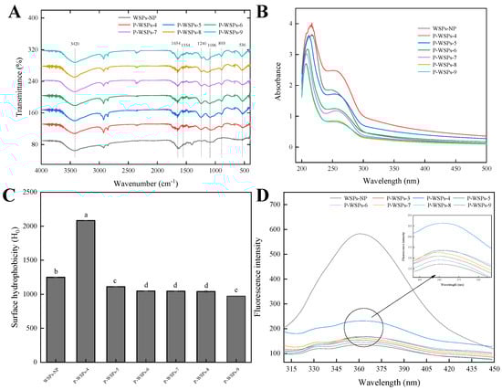 (A) FTIR spectra of WSPs−NP and P-WSPs in the regions from 4000 to 400 cm−1. (B) UV−Vis spectra of WSPs−NP and P−WSPs over a wavelength range from 200 to 480 nm. (C) Surface hydrophobicity index of WSPs−NP and P−WSPs. The data shown are the averages of triplicate independent experiments. Bars denoted with different lowercase letters are significantly different (p < 0.05). (D) The fluorescence spectra of WSPs−NP and P−WSPs over an emission wavelength ranging from 280 to 500 nm at an excitation wavelength of 275 nm.