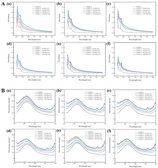 (A) UV−Vis spectra of P−WSPs with different concentrations (50 mM, 100 mM, 500 mM, and 1000 mM) of CaCl2 over a wavelength range from 200 to 800 nm, (a) P−WSPs−4 (b) P−WSPs−5 (c) P−WSPs−6 (d) P−WSPs−7 (e) P−WSPs−8 (f) P−WSPs−9; (B) Fluorescence spectra of P−WSPs with different concentrations (50 mM, 100 mM, 500 mM, and 1000 mM) of CaCl2 over a emission wavelength ranging from 310 to 500 nm at an excitation wavelength of 295 nm, (a) P−WSPs−4 (b) P−WSPs−5 (c) P−WSPs−6 (d) P−WSPs−7 (e) P−WSPs−8 (f) P−WSPs−9.