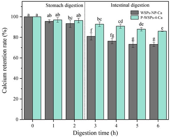 The calcium retention rate of peptide–calcium chelates in the gastrointestinal enzyme environment is illustrated in Figure 6. After 2 h of pepsin digestion and 4 h of trypsin digestion, the calcium retention rates of WSPs-NP were 93.39% and 73.3%, respectively, while those of P-WSPs were 96.41% and 86.02%, respectively. The outcomes showed that pepsin had a negligible impact on the chelate’s stability. The chelate was discovered to be pH-sensitive, and its instability in acidic environments caused the bound calcium to dissociate into an ionic form. In the digestive system, which used two proteases provided sequentially at the appropriate pHs, trypsin may have degraded the peptides, ultimately decreasing their calcium binding ability []. Phosphorylated peptides had significantly improved bioavailability compared with peptides. Their potential interaction with bile acids of the in vitro gastrointestinal digestion system may have decreased calcium chelation. Calcium has low bioavailability because it tends to react with phytic acid or oxalic acid in the stomach, forming insoluble precipitates or Ca(OH)2 in the small intestine [,]. Trypsin may reduce the peptide’s ability to bind calcium during intestinal digestion. Polypeptides that combine with phosphate can hinder the formation of insoluble calcium phosphate in the intestine, consequently enhancing calcium’s bioavailability. Due to their high stability and calcium retention ability during chelation and digestion processes, P-WSPs-4 can aid in calcium absorption.