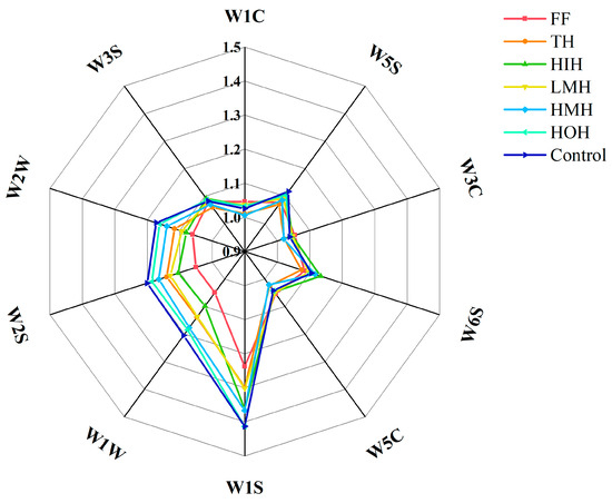 The gas produced by fish after deterioration is mainly composed of volatile compounds; notably, aldehydes and ketones, unsaturated alcohols, and inorganic sulfides [31,32]. Figure 1 presents the results of the analysis of fish fillets under different treatments after freezing and thawing, where the control group exhibited the highest response values for sulfides (sensors W1W, W2W) and alcohols (sensor W2S), indicating a remarkable deterioration in the odor quality of the fish fillets. The reason for this may stem from the increased degree of protein denaturation and fat oxidation under repeated cycles of freezing and thawing, whereas alcohols are primarily generated through the reduction of sugars, amino acids, and aldehydes, as well as the enzymatic oxidation of fatty acids [33]. However, the response to these odor-inducing substances showed a gradual decrease across different treatments, with HMH, TH, and LMH exhibiting progressively lower sensor responses. Among these treatment groups, the HIH sample showed the most substantial reduction in response values for all three sensors, trailing only behind the fresh fish sample.