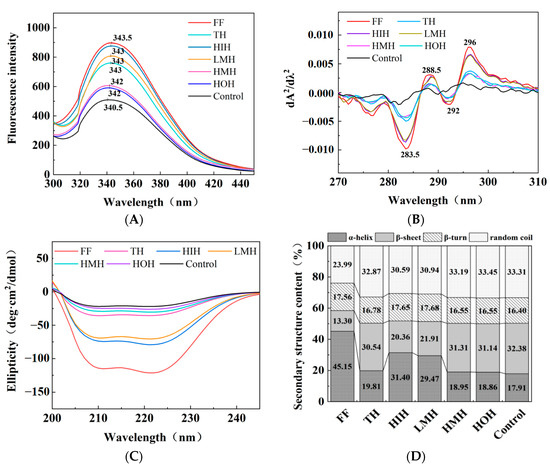 Changes in the tertiary structure of proteins can be inferred from alterations in the microenvironments surrounding specific amino acid residues such as tryptophan (Trp) and tyrosine (Tyr) [20]. Figure 2B shows the UV second-order derivative spectra of MFP, where absorption peaks at 288.5 nm were attributed to both Trp and Tyr residues, and a distinct peak at 296 nm was associated with Trp [13,15]. The absorption peaks at 296 nm of the control group were blueshifted when compared with those of the other groups, suggesting that protein oxidation occurred during freezing and thawing, resulting in the exposure and aggregation of hydrophobic residues. Interestingly, HIH and LMH samples were redshifted (i.e., shifted to longer wavelengths) at the 296 nm peak relative to the TH, HMH, HOH, and control groups, suggesting a stabilization effect of HIH and LMH treatments on the protein structure against oxidation.