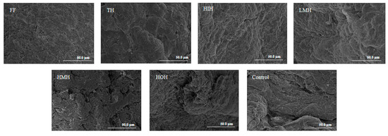 The microstructures of the fish fillet surfaces after the freeze-thaw treatments are shown in Figure 3. The surface of the FF group samples showed a dense and smooth fibrous reticulation structure, in contrast to the control group, which displayed significant structural degradation characterized by pronounced fissures and extensive fibrous gaps. Both the HMH and TH samples presented varying content of fibrous discontinuities, which may be attributed to the ice crystals in the freezing and thawing process damaging the fibrous structure, leading to dehydration of the muscle cells [37]. In contrast, the LMH group demonstrated more defined fibrous tissues with reduced inter-fiber spacing. Moreover, the surface fiber texture of HIH fish fillets after further separation was notably refined and compact. These results indicate that HIH promoted better water retention, and this phenomenon was supported by the moisture loss results (Table 2). In summary, the treatment of fish fillets with HIH reduced tissue damage, protected the fiber mesh structure, and improved the stability of fish meat after the freeze-thaw cycles.