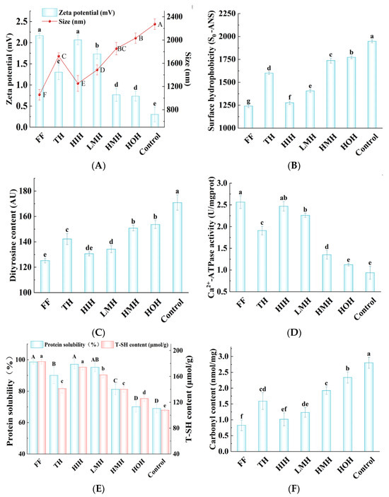 Zeta potential (ζ) is an indicative index of colloidal stability in protein systems, indicated by the charge of proteins. Furthermore, the effective particle size reflects the extent of protein aggregation and oxidation [38,39]. When the ζ absolute value (|ζ|) of the protein solution is smaller, there are fewer charges on the surface of proteins, which could decrease electrostatic repulsion and cause the system of protein molecules to tend to aggregate, thus increasing the effective particle size; therefore, the stability of the solution will be reduced [17,40]. As shown in Figure 4A, the average ζ values of the control, HMH, TH, LMH, and FF group samples were 0.30, 0.76, 1.30, 1.73, and 2.16 mV, respectively. These values were inversely correlated with the effective particle sizes, measured at 2273.40, 1851.96, 1722.00, 1485.60, and 1059.20 nm, indicating a trend where increasing zeta potential corresponded to decreasing particle size. The reduction in particle size may be attributed to the inhibition of ice crystal formation by the treatments, thus reducing protein denaturation and aggregation. Notably, the HIH sample showed a ζ of 2.06 mV and an effective particle size of 1253.33 nm, ranking it second to the FF group in terms of performance. This indicates that the HIH treatment could effectively inhibit the aggregation of proteins during the freeze-thaw cycles, thereby enhancing the stability of the protein system.