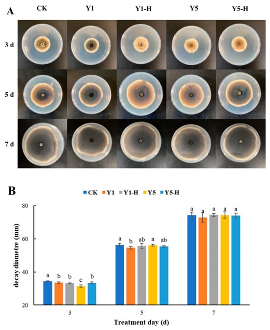 The potato dextrose agar (PDA) solid medium was center-punched with 8 mm diameter holes, and 20 μL of cell-free supernatant (Y1 and Y5, supernatant collected from 1 and 5 day culture, respectively), heat-killed cell-free supernatant (Y1-H and Y5-H, supernatant collected from 1 and 5 day heat-killed culture, respectively), and sterile water (CK) was added, respectively. The A. alternata spore suspension of 20 μL was added into the hole at an interval of 10 min and cultured continuously for 7 days. The growth trend of pathogen was observed, and the growth diameter was measured. The experiment was repeated twice with 3 parallel subjects in each group [16]. Details about the control and treatment groups of this experiment are listed in Table S1.