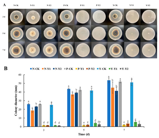 Solid media NYDA, PDA, and yeast extract peptone dextrose medium (YPD) were covered with 100 μL yeast suspension (1 × 108 cells/mL) for 24 and 48 h, respectively. In the control groups, sterile saline was added to the solid media instead of yeast suspension. Details about the specific control and treatment groups are provided in Table S2. The center of solid medium was drilled, and 20 μL fungal spore suspension was added, dried, interlocked with yeast plates cultured for 48 h, wrapped with a sealing film, and cultured continuously for 7 days at 25 °C. The growth state of A. alternata was recorded every day [16].