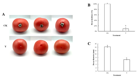A sterile sealed box was filled with 350 mL of PDA medium. For the treatment group (Y), 1 mL of W. anomalus was inoculated into the medium. The control group (CK) was added with sterile water instead of yeast. Tomatoes inoculated with A. alternata were placed in a sterile sealed box and stored under a constant temperature seal (20 °C). The black spot incidence of tomatoes was observed 5 days later [16]. Details about the control and treatment groups of this experiment are listed in Table S3.