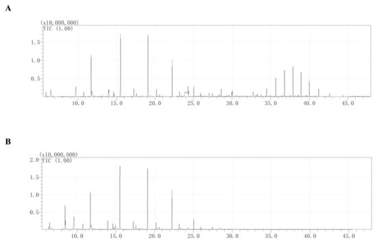 (A): GC-MS spectra of volatile organic compounds of CK; (B): GC-MS spectra of volatile organic compounds of W. anomalus.