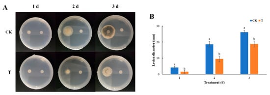 The inhibitory effect of isoamyl acetate on A. alternata. (A): A direct view of isoamyl acetate fumigation A. alternata; (B): The effect of isoamyl acetate fumigation on the colony diameter of A. alternata. Different letters represented significant difference (p < 0.05).