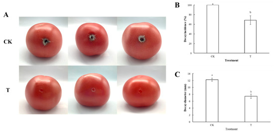 After fumigation by W. anomalus, tomato postharvest black spot disease was suppressed, as Figure 3A illustrates. The tomatoes in the control group had a rot rate of 100%, while the tomatoes in the W. anomalus fumigation group had a rot rate of 9.3%, indicating a substantial inhibitory effect (p < 0.05), as demonstrated by Figure 3B,C. The rot diameter of tomatoes in the control group was 14.2 mm, and those in the W. anomalus fumigation group were 6.8 mm. It had an excellent inhibition effect on the spread of the lesion diameter (p < 0.05). Therefore, W. anomalus fumigation can significantly reduce the incidence of black spot disease and potentially control postharvest diseases.
