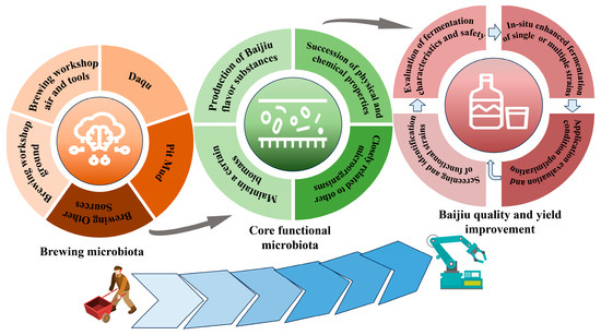 In general, the quality of Baijiu can be intuitively reflected by its typicality and stability, which are directly related to its flavor [11]. During the brewing process, microbiota dominates the metabolism of various raw material components, leading to the metabolization of most of the flavors of Baijiu [11,12]. Regulating the brewing microbiota has proven to be an effective method for improving the quality of Baijiu. However, a clearer understanding of the brewing technology mechanism is necessary. Currently, production is often based on past experience, which leads to instability in the quality of Baijiu due to a lack of understanding of the brewing mechanism. To stabilize and improve the quality of Baijiu, it is necessary to conduct thorough research on the sources of brewing microorganisms, their interactions, and the impact of raw materials and technology on the final product. Furthermore, the solid-state brewing method of Baijiu prohibits the addition of non-fermentable substances from external sources. To obtain stable and high-quality Baijiu, there are two methods: adding microorganisms to change the initial microbiota, or adjusting the technology and raw materials to influence the brewing microbiota succession. These methods can regulate the production of Baijiu. Currently, scholars are using multiomics technologies such as metagenomics and multivariate statistical methods like source tracker and partial least squares to address the aforementioned issues. This research will pave the way for the gradual realization of regulated and standardized ecological Baijiu brewing [13,14,15].