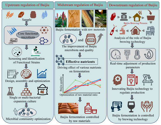 Although bio-enhanced fermentation strategies can promote fermentation and regulate the microbiota of Baijiu, the transformation from traditional Baijiu brewing to controllable, mechanized, and efficient modern Baijiu brewing has not yet been achieved. Raw materials and brewing technology are important components in shaping the microbiota of Baijiu brewing. Raw materials and brewing technology can regulate the growth and metabolic activities of microorganisms by controlling the nutrient diversity and environmental, physical, and chemical factors of the brewing microbiota. Therefore, a biofortification strategy was employed upstream of brewing to enhance the fermentation process. The midstream brewing process optimizes the ratios of raw materials to regulate the growth and metabolism of the brewing microbiota. In the downstream brewing process, control is utilized to promote co-survival and co-fermentation among brewing microorganisms (Figure 2). Multiple control instruments are combined to achieve better control effects and promote the controlled evolution of Baijiu brewing.