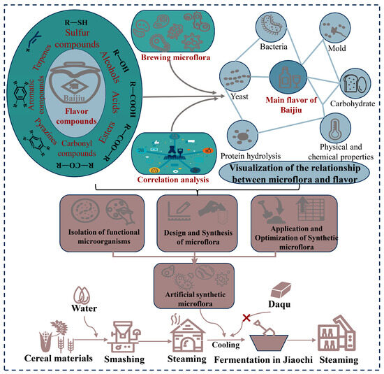Consumers’ preferences for fermented foods, such as Baijiu, are closely related to the composition of the food’s flavor substances. Compounds associated with the senses of smell and taste are known as flavor substances [127]. In the Baijiu fermentation micro-ecological system, the microbial population converts various substrates to produce flavor substances. The microorganisms have a clear division of labor, with some being responsible for producing hydrolytic enzymes that catalyze the hydrolysis of carbohydrates and proteins, while others are responsible for producing catalytic enzymes that catalyze the metabolism of various flavor compounds. To regulate and improve the quality of fermented foods, natural fermentations are transformed into controlled fermentations using synthetic microbiota. This is achieved by understanding the link between microbiota and the formation of flavor compounds. Flavors can guide microbial isolation, assembly, and deployment to create artificial colonies that replace complex natural fermentation patterns (Figure 3) [128].