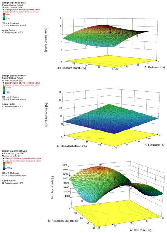 Three-dimensional surface plots of the results of the response surface method (RSM) for specific volume, crumb hardness and numbers of cells based on a constant concentration of 2.5% AgriFiber SFC plus variations of Fibersym RW and VITACEL L 600-30.